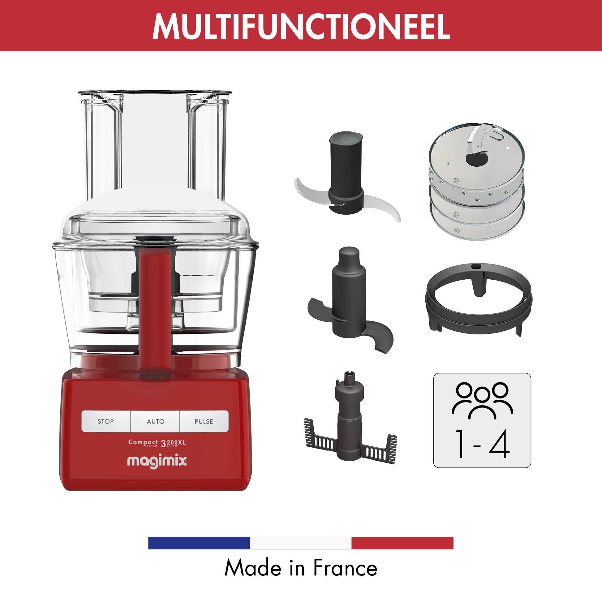 Deze foodprocessor is geheel van Franse Origine. De machine bevat een energiezuinige en zeer professionele inductiemotor waarop maar liefst 30 jaar garantie wordt gegeven! De messen en schijven zijn gemaakt oor Sabatier in Thiers, het topmerk op het gebied van snijden en raspen. De foodprocessor is tevens uit te breiden met nog meer accessoires, zoals de citruspers, juicekit of pureekit. Tevens is de foodprocessor 3200XL verkrijgbaar in de kleuren Mat Chroom en Rood.