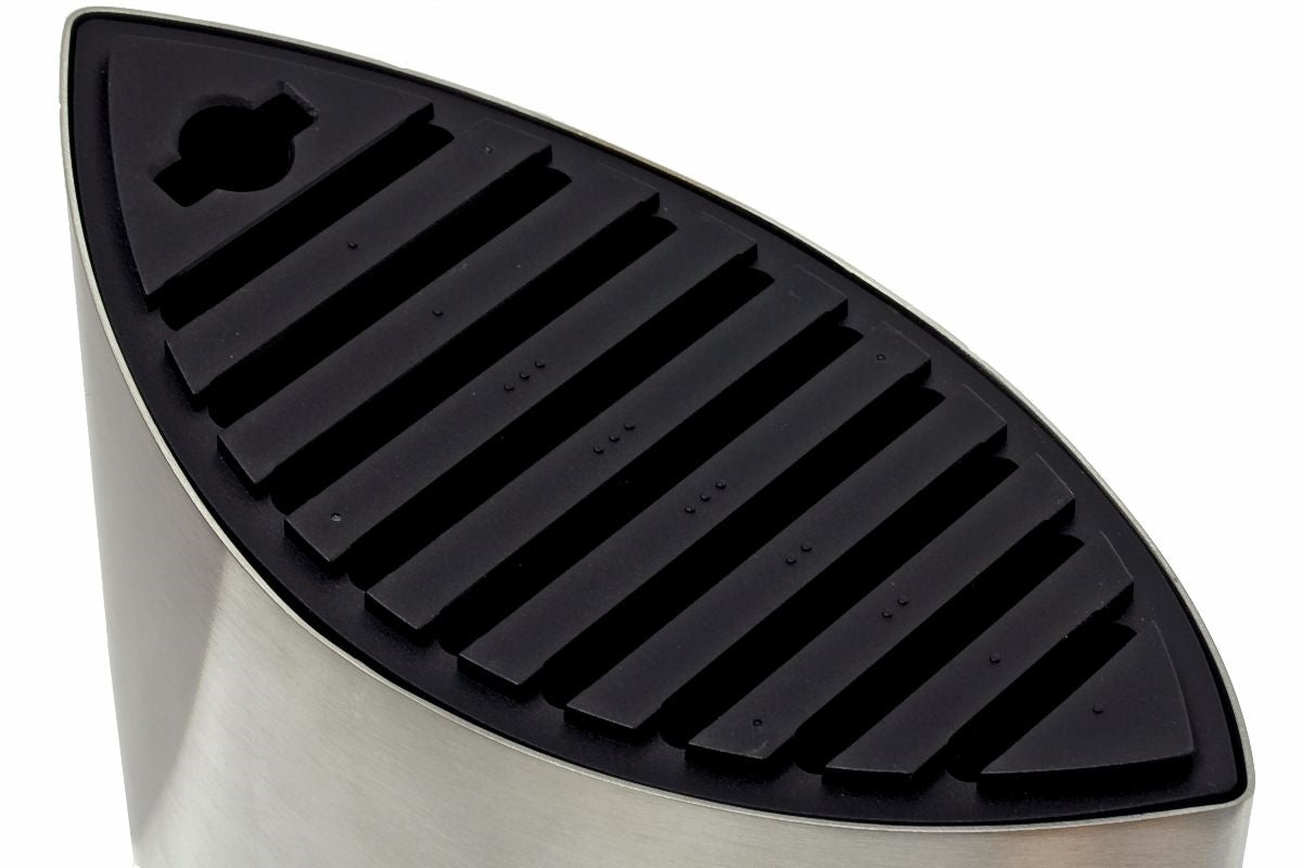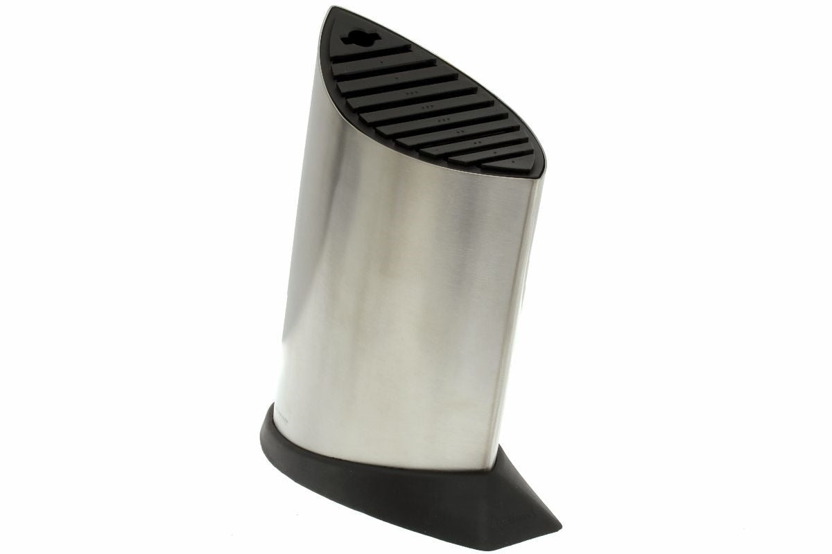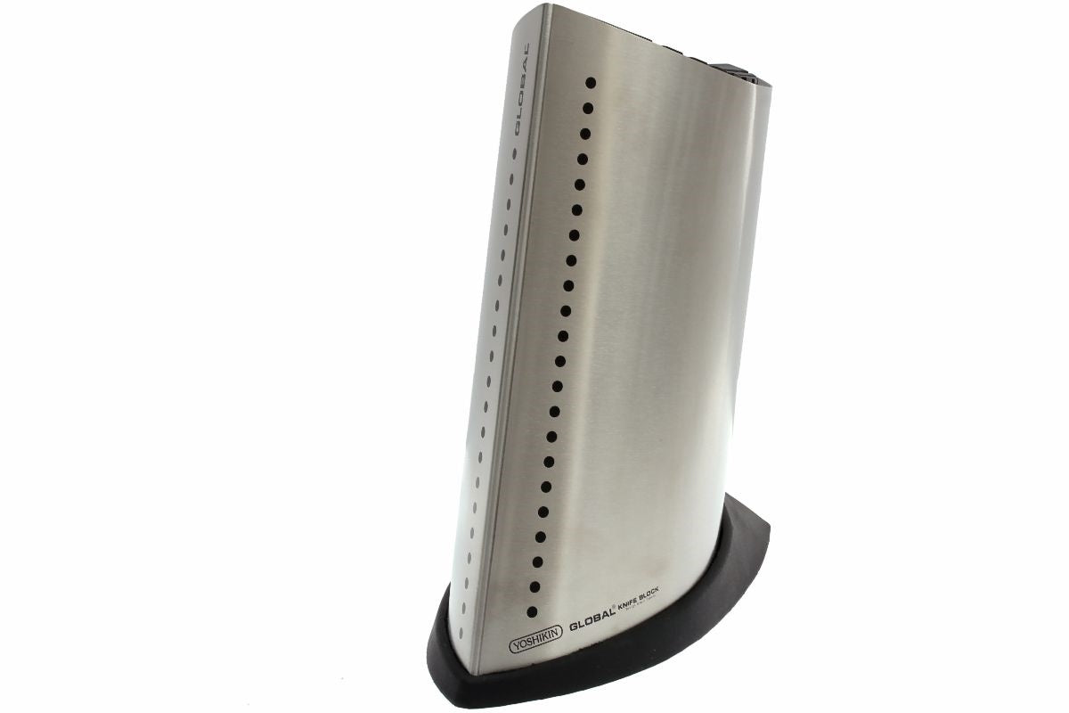 Het messenblok van Global is gemaakt van roestvrijstaal en biedt ruimte voor het bewaren van 9 keukenmessen. Het messenblok is ontworpen in de vorm van en boot en heeft een modern uiterlijk. Het messenblok heeft een smal design en neemt weinig ruimte in op het aanrechtblad. Het is ook mogelijk om naast de keukenmessen een keukenschaar of aanzetstaal in het blok op te bergen.