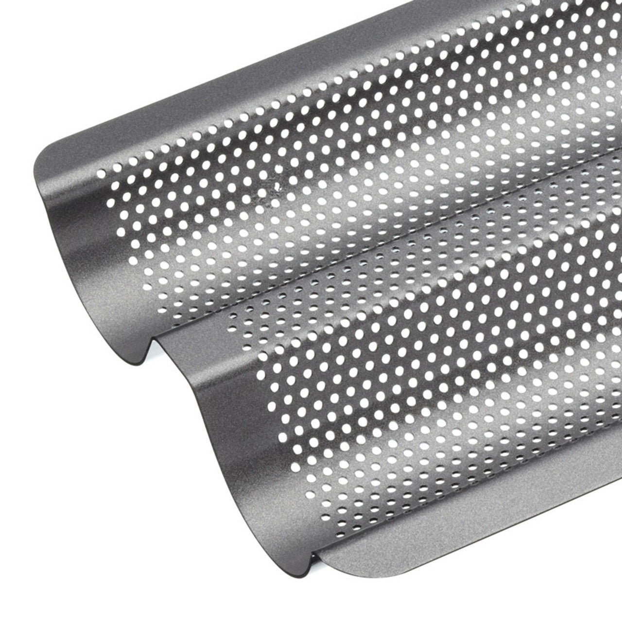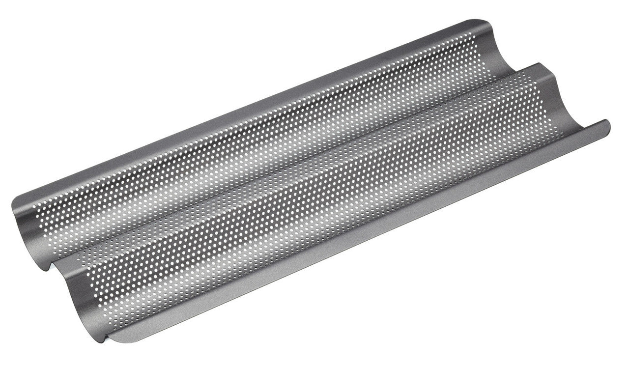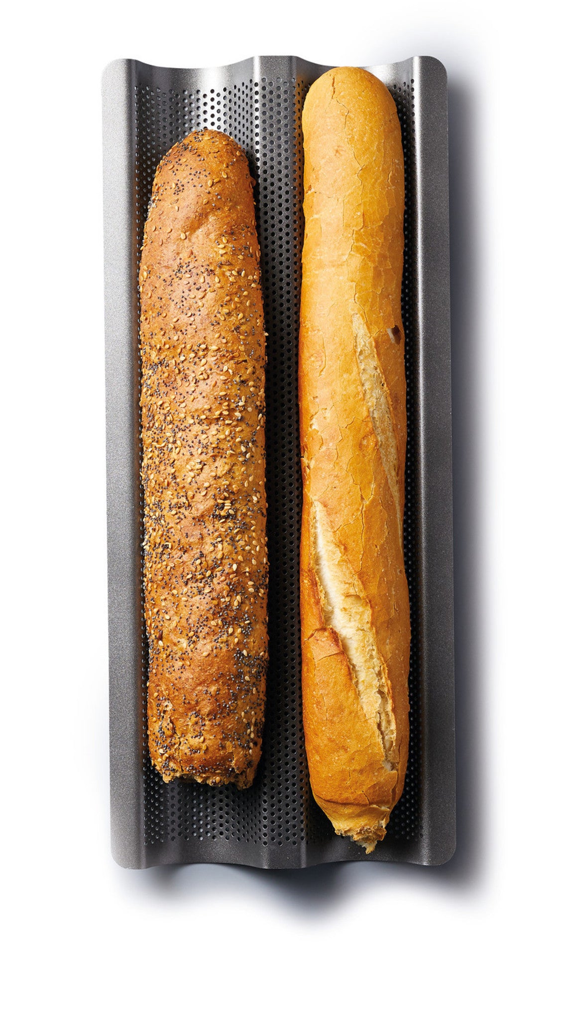 Er gaat niets boven de geur van vers gebakken brood. Met deze bakplaat voor stokbroden uit de meermaals bekroonde* MasterClass Crusty Bake collectie kunt u altijd die perfecte combinatie van een knapperige korst en mooi luchtig brood bereiken - of u nu stokbrood van vers deeg bakt of voorgebakken stokbrood opwarmt. Afmeting 39 x 16 x 2,5 cm en heeft halve maantjes voor twee gewone baguettes.