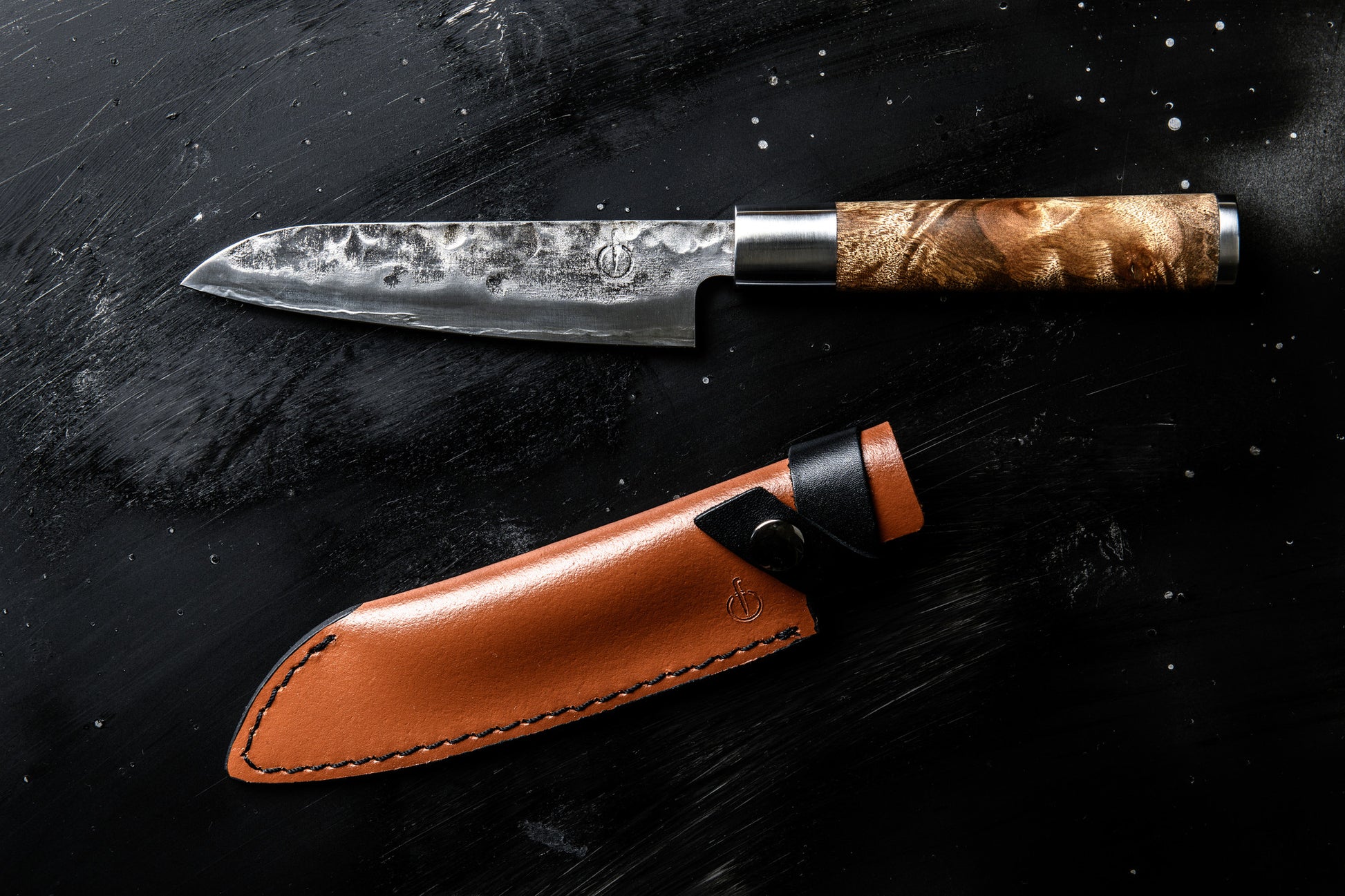Het santokumes van de VG10 serie van Forged is gesmeed in vijf lagen en heeft een uitgesproken en robuust uiterlijk. Het santokumes is ideaal voor het precieze snijwerk in de keuken. Het lemmet heeft een dikte van 2 mm en het heft is gemaakt van prachtig wortelhout. De lemmetlengte van het mes bedraagt 14 cm. Het mes is vervaardigt uit Japans VG10 staal en heeft een hardheid van 60 Rockwell. Het mes wordt in een mooie geschenkdoos geleverd samen met een leren beschermhoes. Was het mes na gebruik met de hand af.
